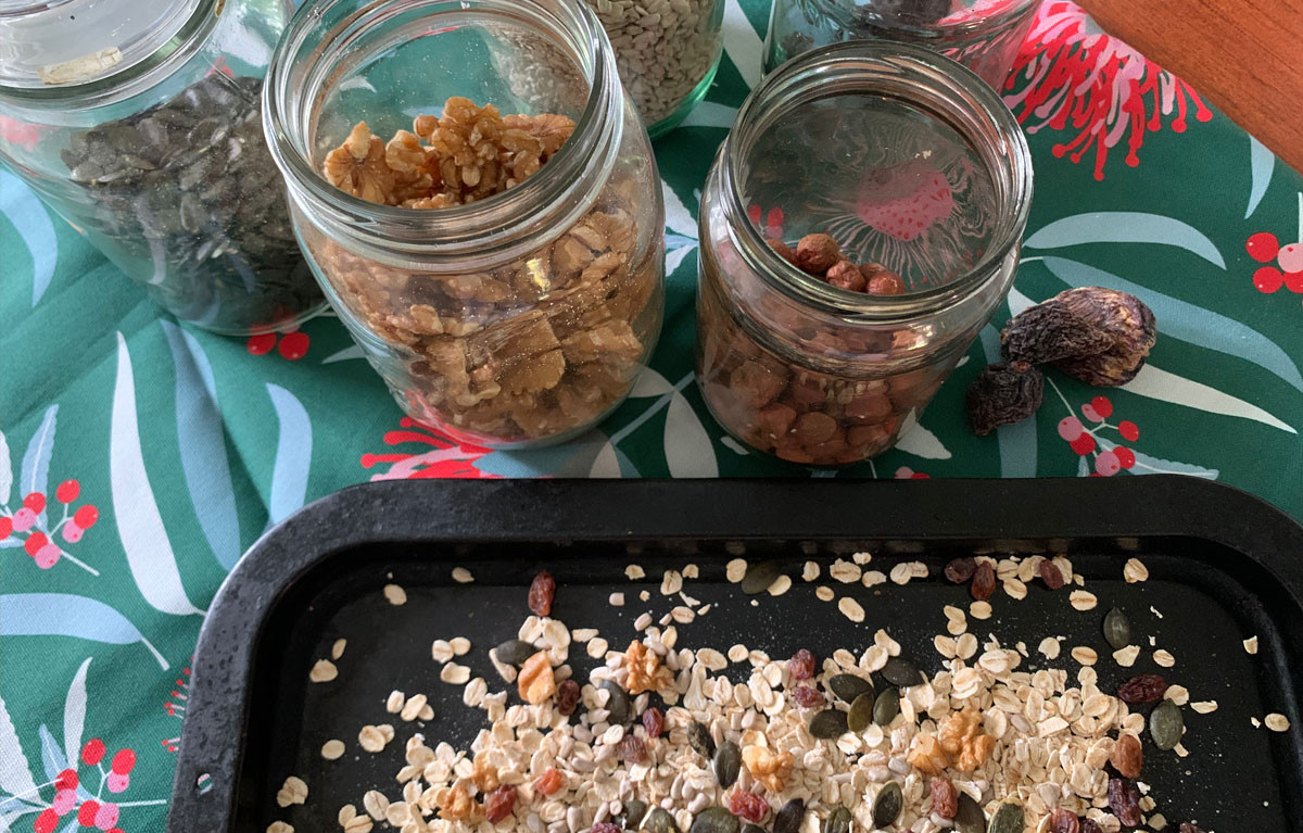 We used a combination of raw almonds, hazelnuts, walnuts, pumpkin and sunflower seeds, combined with dried figs and sultanas for our granola.