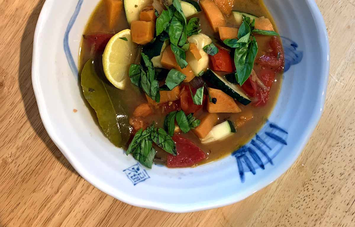 You can either use bone broth or veggie if you want to make it completely vegetarian/vegan. We like it served over brown rice, but you can use soba noodles or quinoa or simply eat as is for a light meal. We sometimes add extra veggies such as pre-roasted sweet potato and zucchini (as pictured above).
